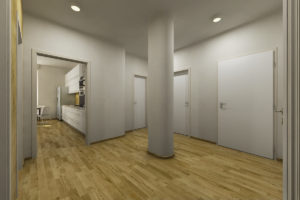 Vzhledem k problematičnosti lokality z hlediska dopravní obslužnosti, resp. nepřístupnosti místa autem a chybějící parkovací kapacitě se hledalo vhodné využití stávajících bytů. Ze dvou zpracovaných variant, kde první řešila komfortní bydlení a druhá maximalizovala počet obytných místností, se investor přiklonil k členitější dispozici. Ta je vhodnější pro účely pronájmu bytové jednotky studentům.