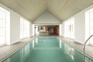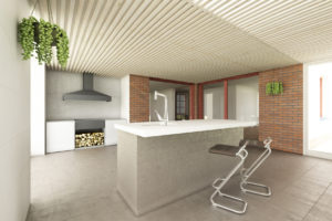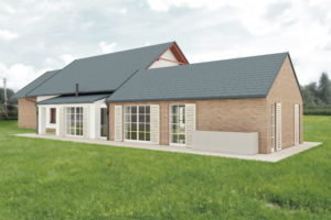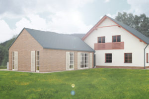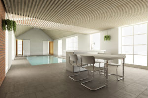 Navržená přístavba slouží jako vnitřní krytý bazén a je objemově pojednána jako jednopodlažní hmota se sedlovou střechou s totožným sklonem jako u stávajícího domu. V místě kontaktu se stávajícím domem střecha uskakuje přes prosklený krček na menší sklon kvůli napojení přístavby na stávající dům.
