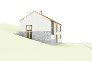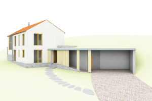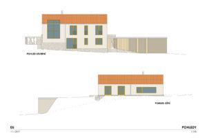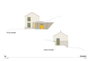 Rodinný dům je umístěn na hranu terasy původní cesty a je částečně zapuštěn do severního svahu zvedajícímu se k jižní hranici pozemku. Dům je dvoupodlažní jednoduchého obdélného půdorysu se sedlovou střechou o sklonu 30°, ke kterému je přičleněna jednopodlažní hmota skladu zahradního vybavení a krytého stání, umístěného v přímé návaznosti na vjezd na pozemek. Tato obslužná část objektu je zastřešena plochou zatravněnou střechou, která bude navazovat a částečně dotvoří stávající travnatý svah.