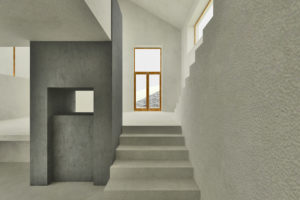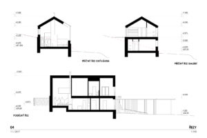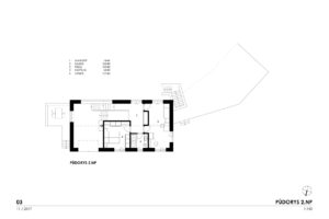 Ze zvýšeného obytného prostoru vedou schody na galerii ve druhém podlaží. To je řešeno jako klidová noční zóna s ložnicí, pokojem a koupelnou. Všechny obytné místnosti jsou přirozeně prosvětleny a mimo ložnici, která má okna pouze na severní fasádu, i osluněny.