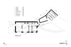 První podlaží rodinného domu, kam se vstupuje ze závětří na jeho západní fasádě, slouží běžnému dennímu provozu. Vstupuje se do zádveří, na které navazuje komunikační zóna – chodba, vedoucí do pracovny, technické místnosti, na záchod s přidruženým sprchovým koutem a do kuchyně. Kuchyň je v části navazující na chodbu otevřena přes obě podlaží až do úrovně střechy. Z kuchyně vedou schody do zvýšené úrovně, kde se nachází klidový obytný prostor, který je celý otevřený až do úrovně střechy. Obytný prostor a kuchyň opticky odděluje dominantní hmota průhledových krbových kamen umístěných na osu domu.